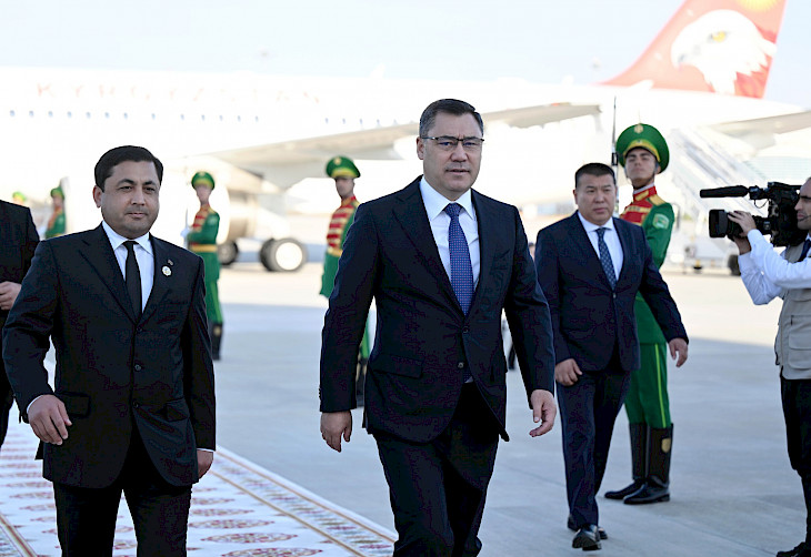 Президент Садыр Жапаровду Түркмөнстандын министрлер кабинетинин төрагасынын орун басары Баймырад Аннамамедов жана башка расмий адамдар тосуп алышты.