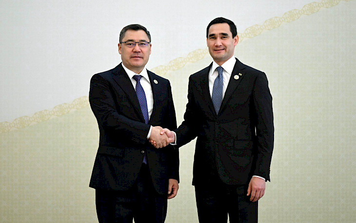 Президенттин басма сөз кызматынан билдиришкендей, мамлекет башчысын Түркмөнстандын президенти Сердар Бердымухамедов тосуп алды. Саламдашуу аземи жана чогуу сүрөткө түшүү аяктагандан кийин делегация башчылары форумга катышуу үчүн залга өтүштү.