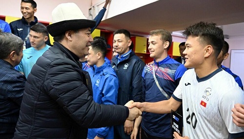 Оюн аяктагандан кийин Садыр Жапаров футбол курамасынын кийим алмаштыруучу бөлмөсүнө барып, ишенимдүү жеңиши менен куттуктады.