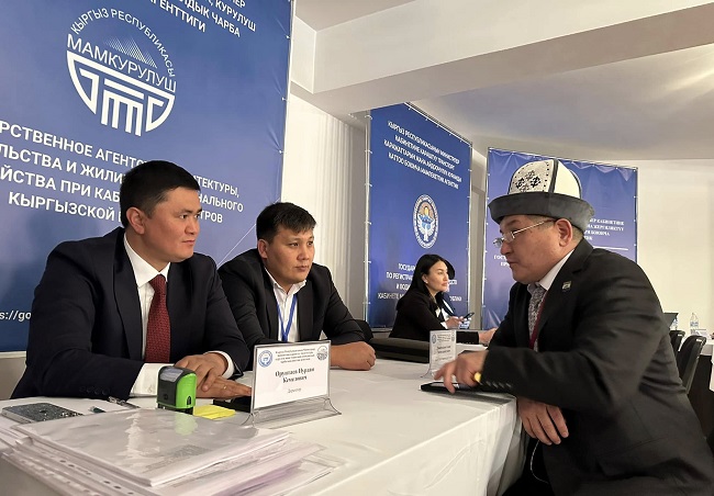 Архитектура, курулуш жана турак жай-коммуналдык чарба мамлекеттик агенттигинин директору Нурдан Орунтаев менен анын биринчи орун басары Самат Жантелиев учурда Бишкекте өтүп жаткан III Элдик курултайдын делегаттарын кабыл алышууда.