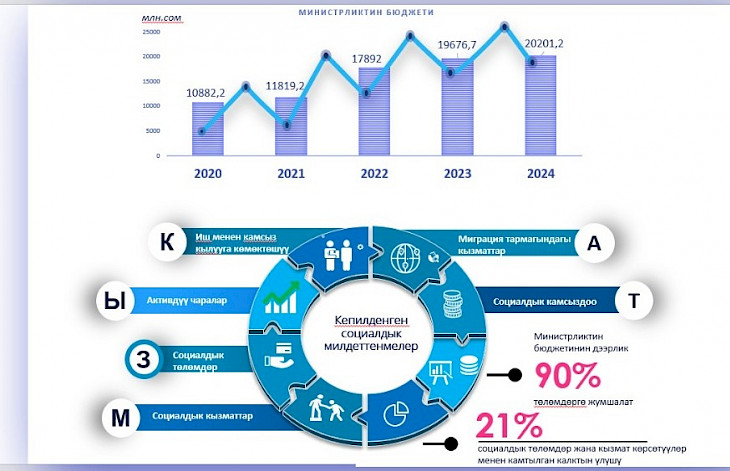“Мындай динамика мамлекеттин элге кам көрүүгө олуттуу көңүл буруп жатканын ачык айкын көрсөтүп турат десем жаңылышпайм. 2020-2024-жылдар аралыгында министрликтин бюджети 86 пайызга же 9 млрд. 319 млн. сомго жогорулаган. Белгилей кетүүчү жагдай, министрликтин бюджетинин 90%ы социалдык жардамдар түзөт”, — деди ал.