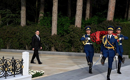 Президент Садыр Жапаров Азербайжандын жалпы улуттук лидери Гейдар Алиевди эскерип, анын күмбөзүнө гүлчамбар койду.