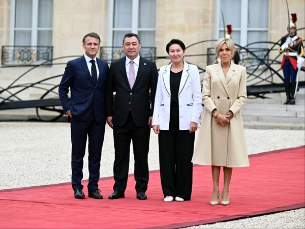 Мамлекет башчысын жана Биринчи айым Айгүл Жапарованы Елисей сарайында Франциянын президенти Эмманюэль Макрон менен биринчи айым Брижит Макрон тосуп алды.