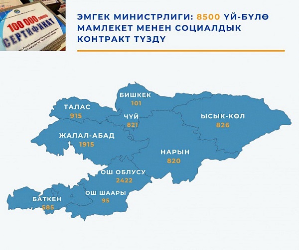 Өлкө боюнча жалпы 8 миң 500 жакыр жана аз камсыз болгон үй-бүлөлөр мамлекет менен социалдык контракт түздү. Бул тууралуу Эмгек, социалдык камсыздоо жана миграция министрлигинин басма сөз кызматы билдирет.