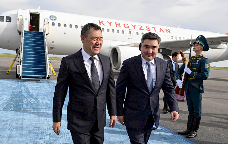 Президент Садыр Жапаровду Казакстандын Премьер-министри Олжас Бектенов жана башка расмий адамдар тосуп алышты.