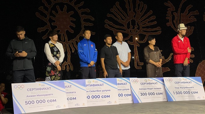 100 миң сомдон баштап 3 млн сомго чейинки акчалай сыйлыктын сертификаттары 8 спортчуга, алардын биринчи жана жеке машыктыруучуларына, курама командалардын машыктыруучуларына тапшырылды.