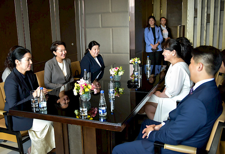 Кыргызстандын биринчи айымы Айгүл Жапарова Улан-Батордо өтүп жаткан “Жашыл келечек жолунда” аттуу Бүткүл дүйнөлүк аялдар форумуна катышуунун алкагында Монголиянын президентинин жубайы Лувсандоржийн Болорцэцэг менен жолугушту.