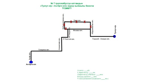 Бүгүндөн тарта Бишкек шаарында оңдоо иштерине байланыштуу №7 троллейбустук каттам жарым-жартылай өзгөртүлгөн кыймыл менен иштейт.