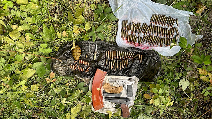 Маалыматка ылайык, жашыруун жерден: граната Ф-1–1даана; эски үлгүдөгү болжолдуу «Браунинг 1900» маркасындагы тапанча; МР 371 маркасындагы сигналдык тапанча; төмөнкү калибрдеги патрондор: 7,62 мм – 26 даана, 7,62 х 54 – 2 даана, 5,45 мм – 81 даана, 9.18 – 17 даана; ошондой эле 1 даана Калашников жеңил автоматынын магазини табылды.